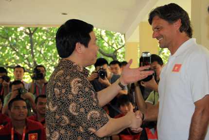 Dù rất bận với Hội nghị các Bộ trưởng tài chính Asean song Bộ trưởng Tài chính Vương Đình Huệ vẫn bớt chút thời gian tới khách sạn Sultan để thăm động viên thầy trò HLV Falko Goetz đang tham dự SEA Games 26 tại Jakarta.