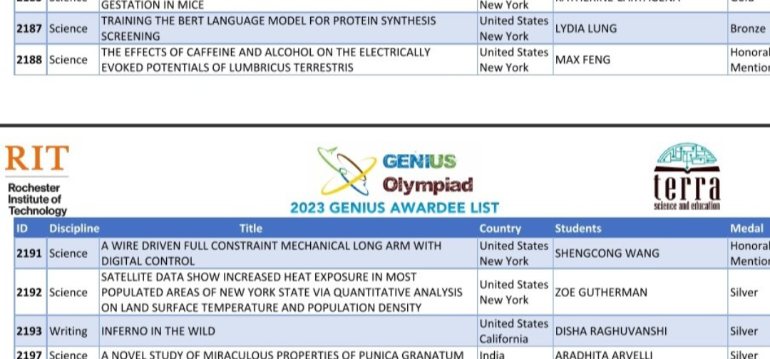 Theo danh sách đoạt giải Genius Olympiad 2023, Việt Nam có 13 đề tài giành giải thưởng ở nhiều hạng mục như Khoa học, Âm nhạc, Mỹ thuật, Viết sáng tạo, Phim ngắn…