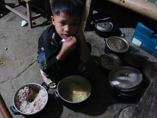 Bữa ăn của học sinh trường tiểu học É Tòng là nồi cơm chan thật nhiều nước mì tôm. 5-6 đứa trẻ chung nhau một gói mì xì xụp húp. Cô Lò Thị Tiên, giáo viên nhà trường cho biết: "Nhiều năm dạy ở trường, tôi chưa thấy các cháu có thịt ăn. Món xa xỉ nhất của học sinh là cá khô nướng nhưng cũng ít khi có để ăn. Cứ cuối tuần các em lại đi bộ về nhà, khi trở lại lưng em nào cũng trĩu nặng bao gạo, rau, đồ ăn gia đình chuẩn bị cho".