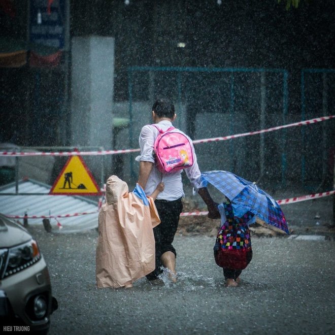 Trong tấm hình, ông bố với chiếc áo ướt đẫm, quần ống cao ống thấp, mặc bản thân bị mưa xối dắt con đi qua đường ngập nước. Bức hình giản dị nhưng lại khiến người ta xúc động trước sự chăm sóc rất đỗi đời thường của người cha dành cho con trong cơn mưa nặng hạt.