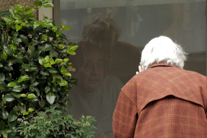Đôi vợ chồng nói chuyện qua điện thoại trong khi nhìn vào nhau qua cửa kính. (Ảnh: Reuters)