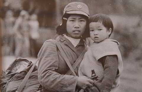 | Tấm ảnh cô bộ đội và em bé của nhà nhiếp ảnh Nguyễn Mạnh Thường |