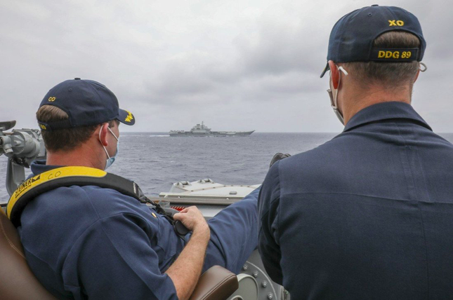 Bức ảnh hạm trưởng và hạm phó tàu khu trục Mỹ gác chân xem tàu sân bay Trung Quốc được chụp vào tháng 4/2021