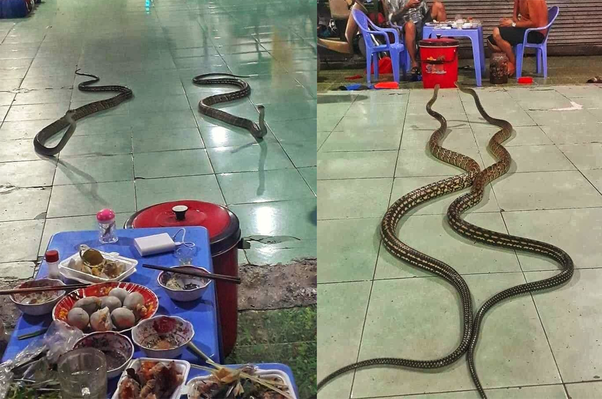 Hai bức ảnh từng được dân mạng chia sẻ rầm rộ và gây ám ảnh không ít. Theo đó, giữa sàn nhà trống trải bên cạnh một bàn ăn vẫn còn đang có bóng các “nhậu thủ” nhâm nhi rượu thì bỗng xuất hiện hai vị khách không mời. Đó không chỉ là hai con rắn thường mà còn trông như thuộc hàng “khủng” với chiều dài và kích thước khá to.