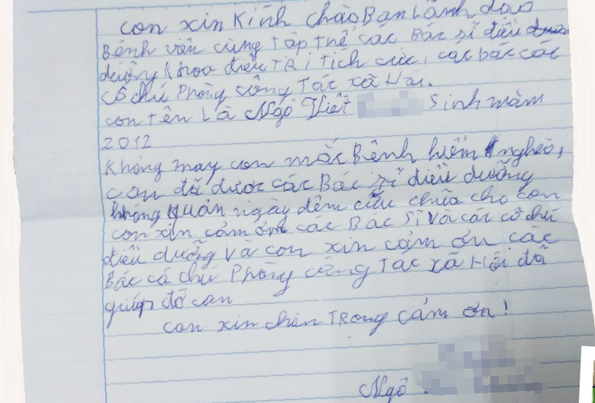 Gửi kèm lá thư của mẹ, là lá thư của bé V.T. Bé cảm ơn bác sĩ bất kể ngày đêm tận tình cứu chữa giúp con thoát khỏi bệnh hiểm nghèo. Bức thư với nét chữ nguệch ngoạc nhưng chứa đựng lòng biết ơn sâu sắc của cậu bé.