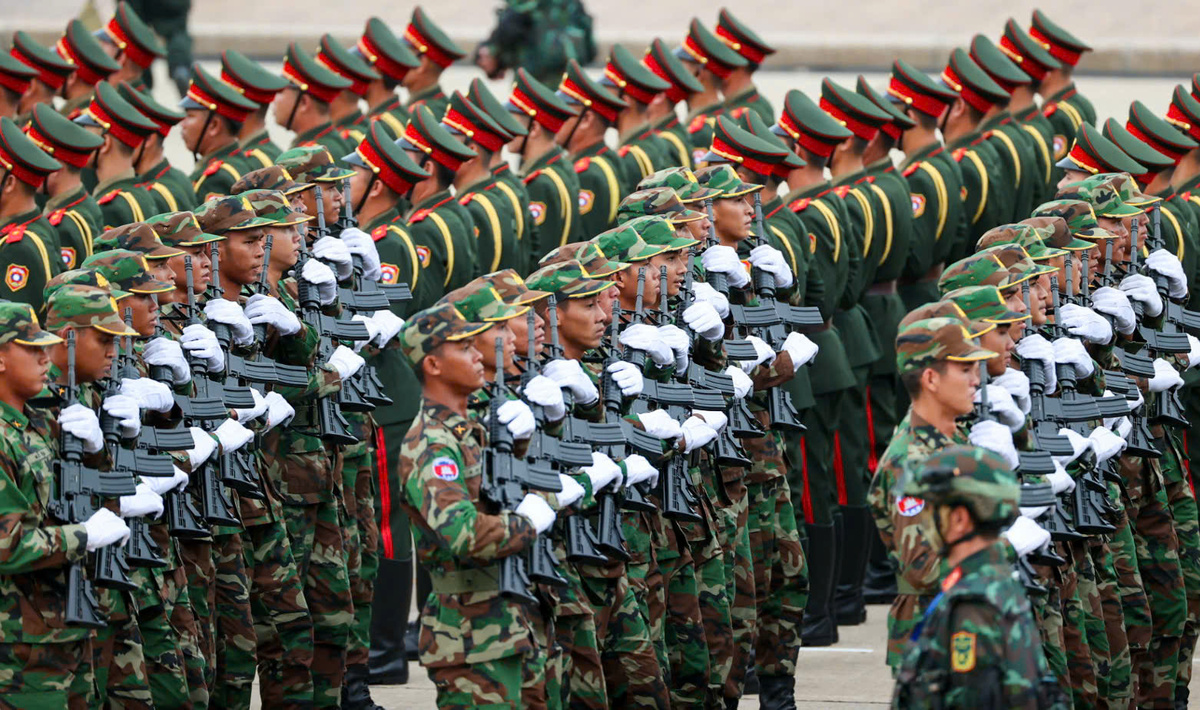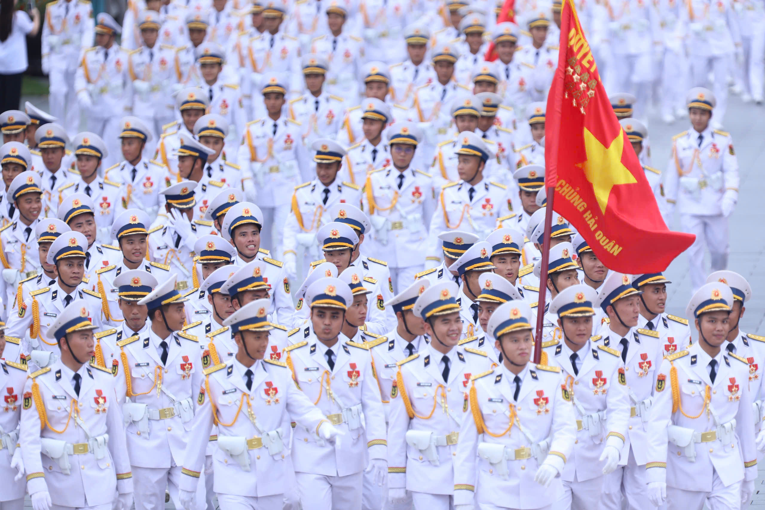 Các khối diễu binh tiến bước trong đội hình chặt chẽ, từng nhịp chân đều toát lên sự kỷ luật và niềm tự hào khi đại diện cho lực lượng vũ trang quốc gia.