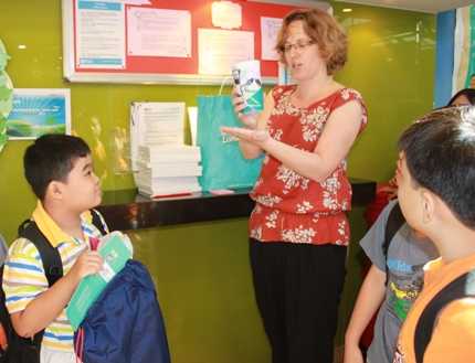 Song Anh (bên trái) nhận giải thưởng từ cô Joanna Adkin, Giáo viên phụ trách Chương trình tiếng Anh trẻ em tại Hội đồng Anh. |