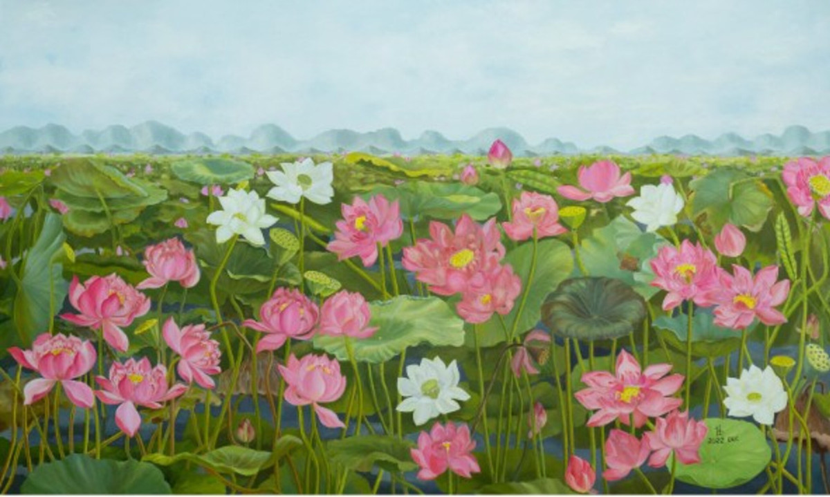 Bức tranh Liên hoa tịnh cảnh được trưng bày trong không gian ngập tràn hương sen. Người xem như được lạc vào thế giới bình yên trong tâm hồn để quên hết muộn phiền. Trong tranh có tiếng gió, có tình yêu đôi lứa, có sự đoàn kết tình làng nghĩa xóm….