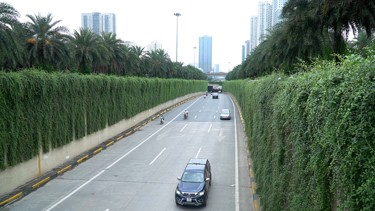 200m tường hầm chui Trung Hòa (Hà Nội) được bao phủ bởi hàng vạn cây cúc tần Ấn Độ, tạo nên con đường xanh mướt tuyệt đẹp.