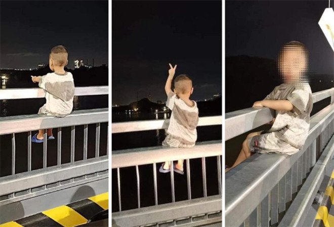 Việc phụ huynh cho con nhỏ ngồi lên lan can cầu chụp ảnh gây phẫn nộ trong cộng đồng mạng. (Ảnh: OFFB)