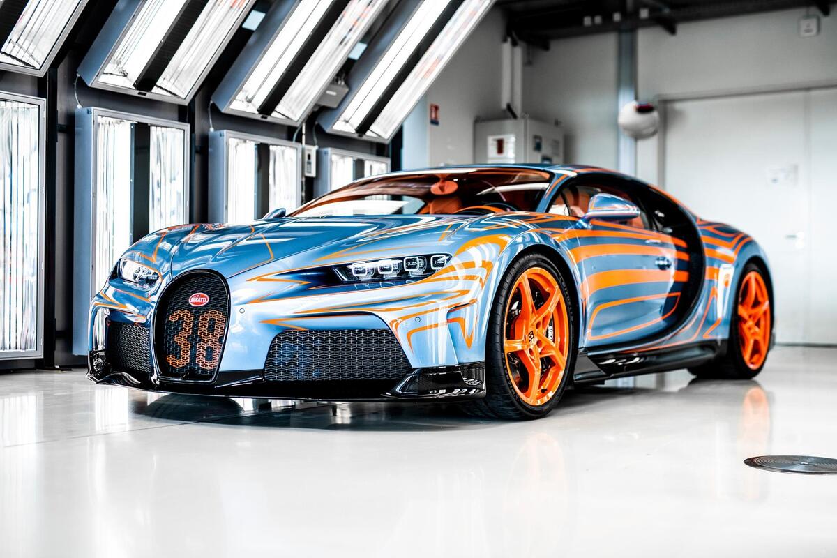 Màu sơn và các họa tiết "Vagues de Lumière" được thực hiện thủ công bởi Sur Mesure, bộ phận chuyên phụ trách những dự án đặc biệt của Bugatti. Cảm hứng của thiết kế lạ mắt này đến từ những vệt sáng phản chiếu trên phần thân của chiếc Chiron Super Sport.