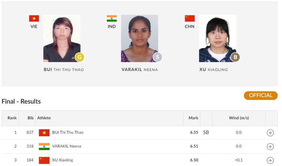 Bùi Thị Thu Thảo đã xuất sắc giành HCV nội dung nhảy xa nữ với thành tích 6,55m. Đây không phải là thành tích tốt nhất của Thu Thảo nhưng cũng đủ để cô mang về tấm HCV lịch sử cho điền kinh Việt Nam. Tấm HCV đầu tiên của điền kinh nước nhà ở đấu trường ASIAD.