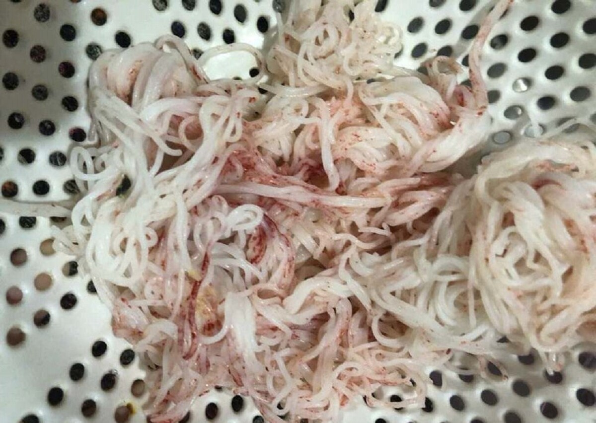 Tuy nhiên, đến khoảng 21h cùng ngày, khi bà lấy ra cho con ăn thì phát hiện nhiều sợi bún đã chuyển sang màu đỏ, mềm và hơi ướt. Đến sáng 7/7, toàn bộ phần bún còn lại đều đổi màu và khi bỏ vào nước lọc thì nước cũng chuyển sang màu đỏ.