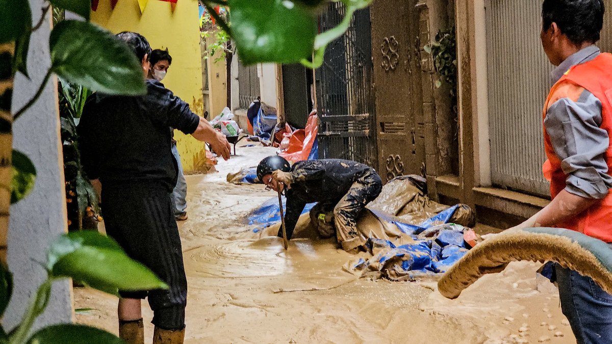 Bùn tràn khắp ngõ 7 phố Giang Văn Minh.