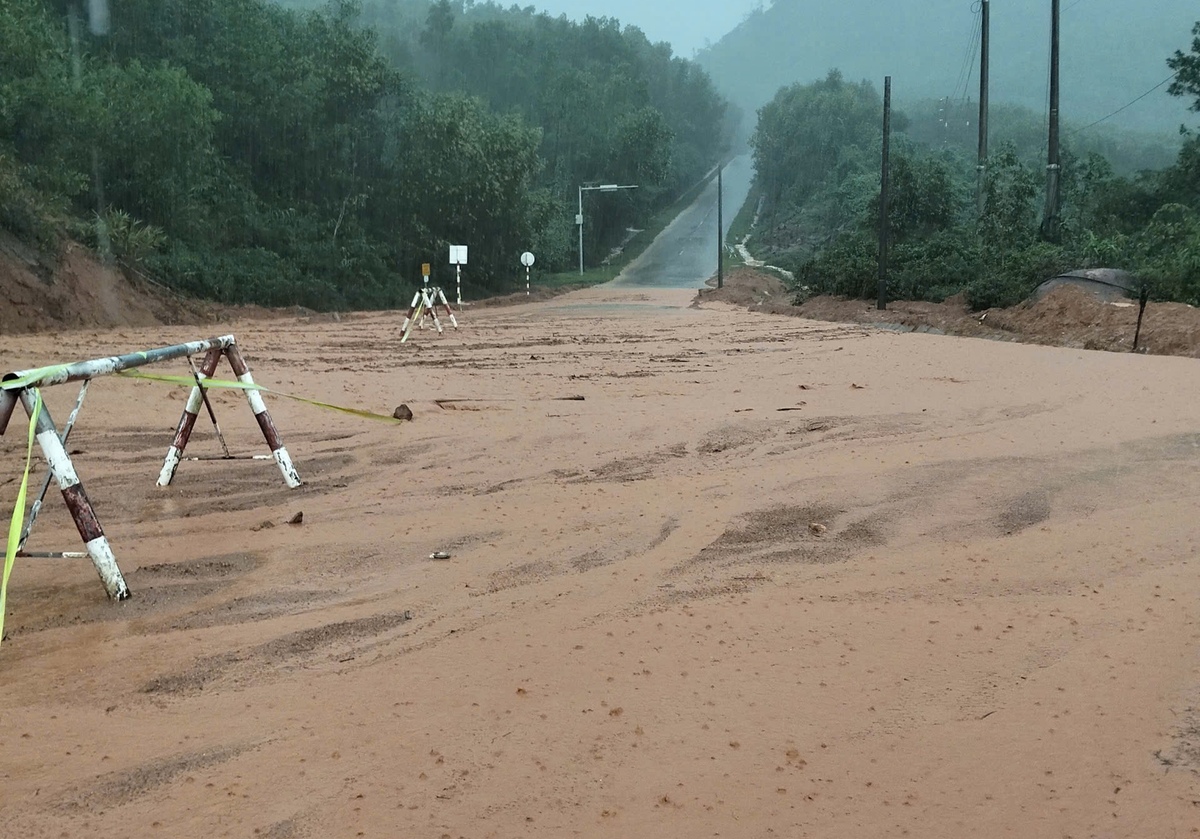 Chiều 3/12, sau trận mưa lớn, lượng bùn đất từ trên đồi tràn xuống vùi lấp đoạn đường vào khu du lịch Laguna (xã Chân Mây - Lăng Cô, TP Huế) gây ách tắc giao thông và tiềm ẩn nguy hiểm cho khu dân cư lân cận.