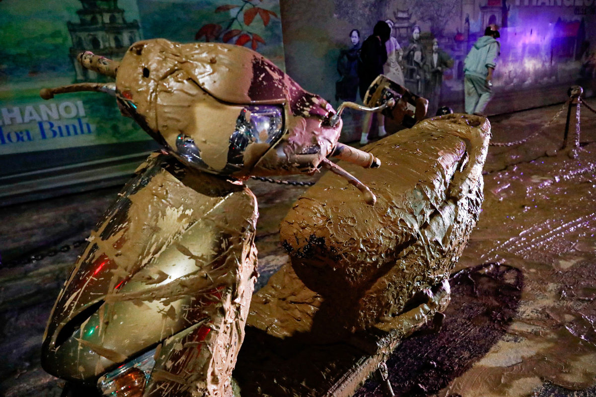 Bùn nhão phủ khắp mặt đường, có màu nâu sẫm, trải dài gần như toàn bộ đoạn gần ngã tư Tôn Đức Thắng - Nguyễn Thái Học. Khi đi qua, bánh xe lún vào bùn, dễ trượt ngã, đặc biệt là trong điều kiện trời tối.