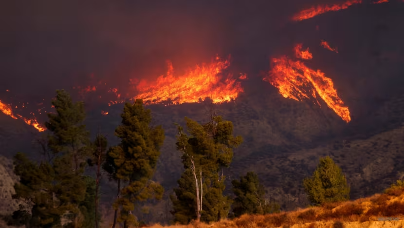 Khói và lửa bốc lên khi lính cứu hỏa và máy bay chiến đấu với đám cháy Hughes gần Hồ Castaic. (Ảnh: Reuters)