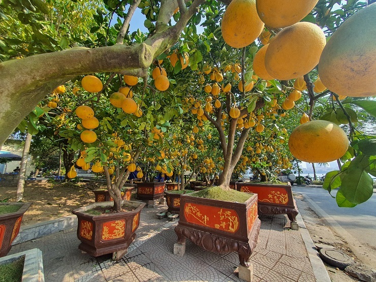 Hàng trăm gốc bưởi cảnh sai trĩu cành cùng hoa đào, mận, quất… được các nhà vườn vận chuyển xuống phố Lạc Long Quân (Hà Nội) phục vụ người dân sắm Tết.