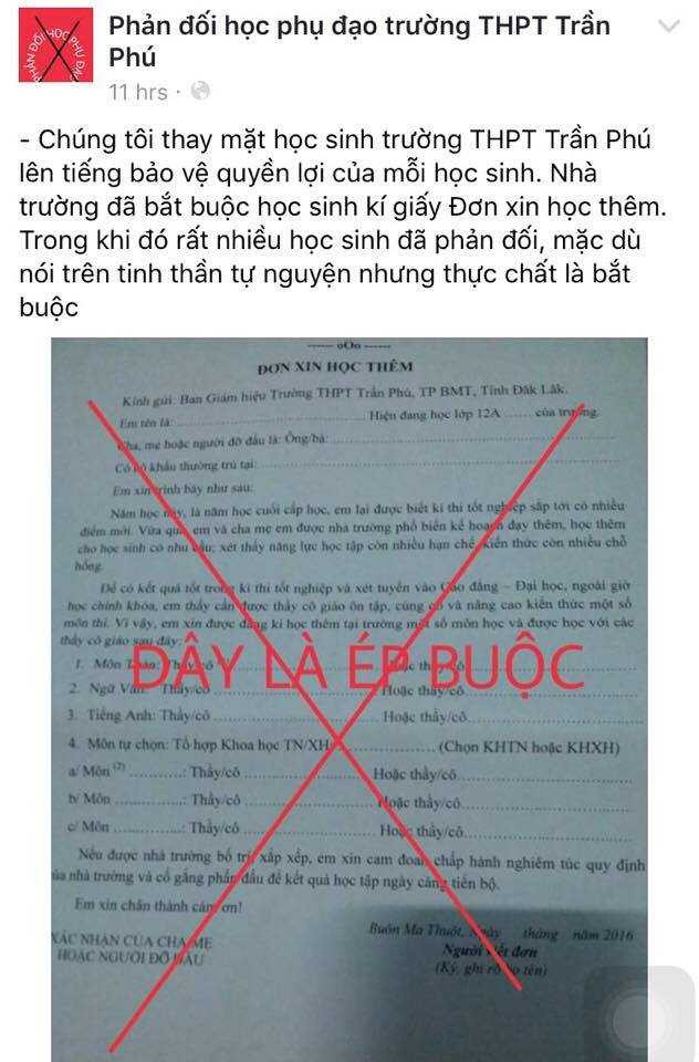 Vừa qua, học sinh trường THPT Trần Phú (TP Buôn Ma Thuột) đã lập một fanpage (một dạng trang tương tác trên mạng xã hội) "Phản đối học phụ đạo Trường THPT Trần Phú" sau khi được nhà trường thông báo và phát phiếu đăng ký học thêm.