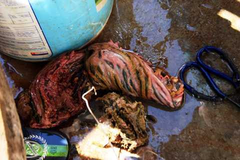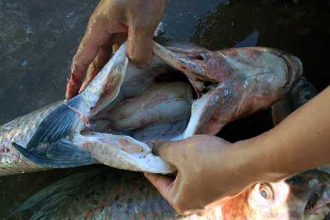 | Cá anh vũ Campuchia có khá to, ăn nhiều rong rêu nên ruột của chúng khá nhiều. Nếu không mổ ra bỏ sớm sẽ bị thối, ảnh hưởng đến chất lượng cá |