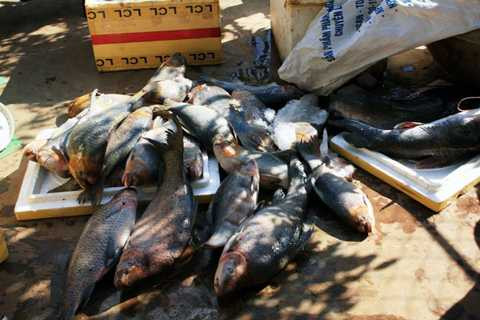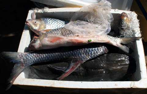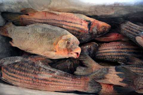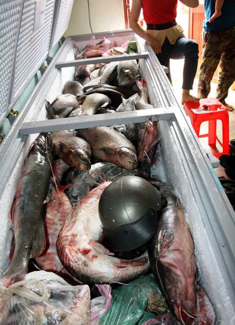 | Cá anh vũ Campuchia được ướp thô sơ bằng đá, vận chuyển qua quãng đường dài nên chết hết |