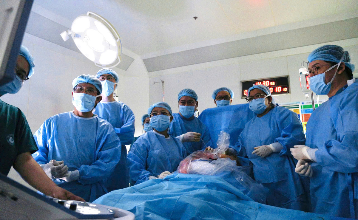 14h ngày 14/10, ca mổ bắt đầu trong điều kiện vô khuẩn tuyệt đối. Dưới hướng dẫn siêu âm, bác sĩ dùng kim 18G xuyên qua thành bụng mẹ, tử cung và lồng ngực thai, tiếp cận buồng thất phải chỉ rộng 6 mm – thao tác đòi hỏi độ chính xác tuyệt đối. Dây dẫn và bóng nong chuyên dụng được luồn qua lỗ van động mạch phổi, thực hiện ba lần bơm nong mở rộng van, giúp máu lưu thông trở lại.