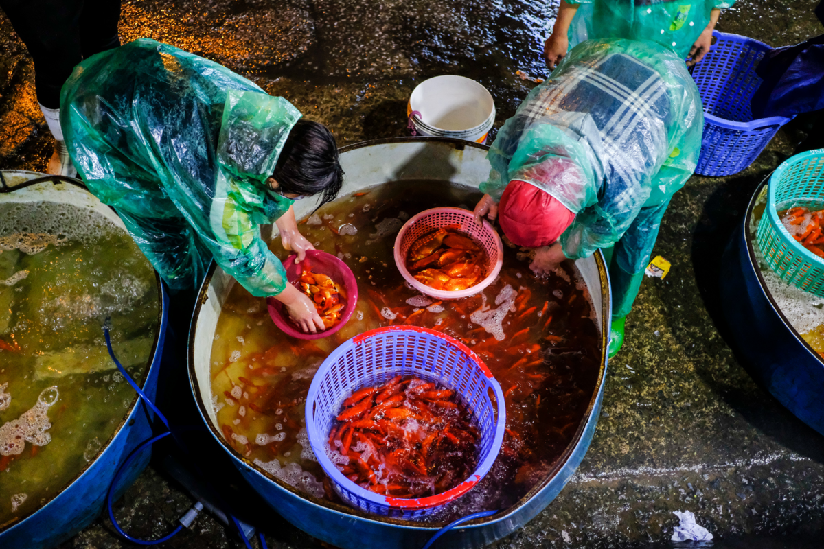 Các lái thương đều tỉ mỉ chọn lựa những con cá khỏe mạnh và đẹp nhất. Những ngày cận lễ cúng ông Công ông Táo, số lượng bán ra có thể lên tới vài tạ một ngày.