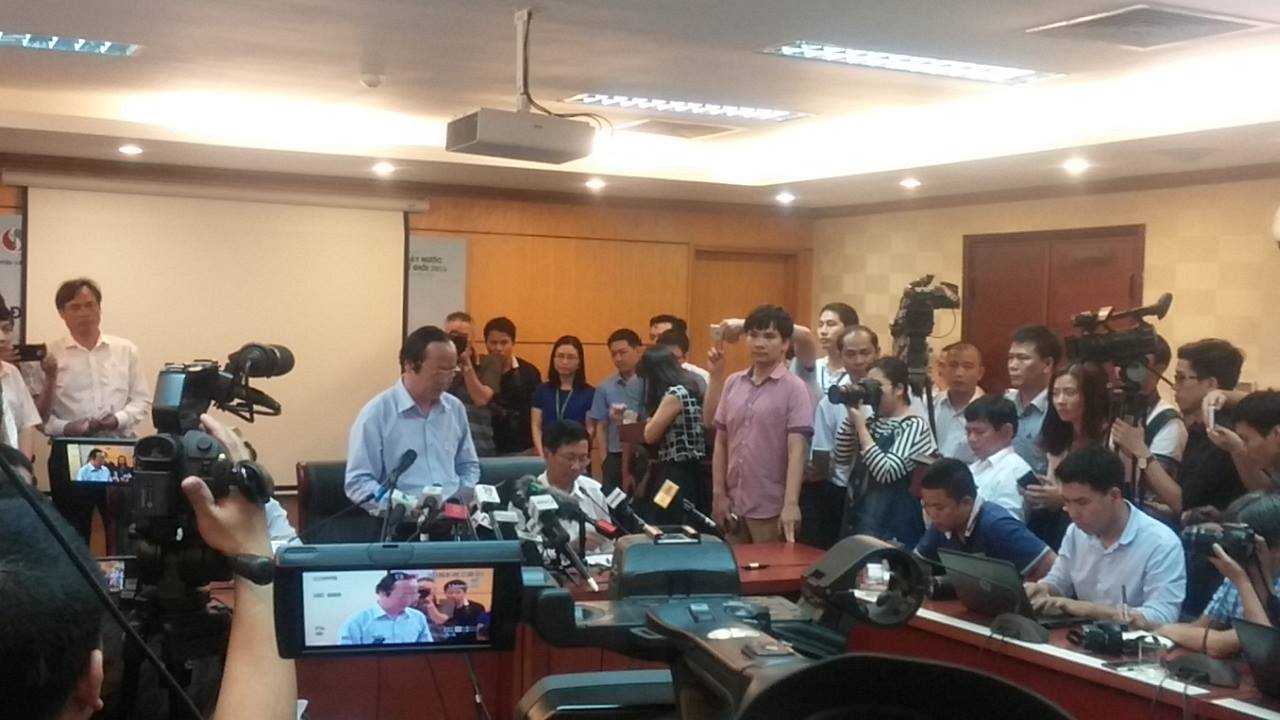 Tối 27/4, sau khi kết thúc cuộc họp 7 bộ ngành, Bộ Tài nguyên - Môi trường đã tổ chức buổi họp thông báo nguyên nhân gây ra hiện tượng cá chết hàng loạt ở bờ biển các tỉnh miền Trung. Ông Võ Tuấn Nhân - Thứ trưởng Bộ Tài nguyên - Môi trường chủ trì buổi họp báo.
