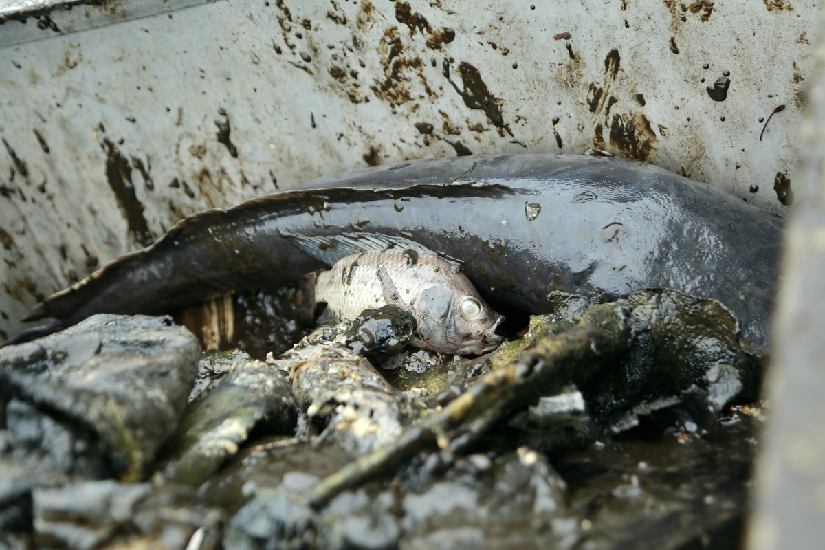 Những công nhân sử dụng vợt lưới để vớt cá chết và rác thải. Các “chất thải lạ” màu đen kết dính vào lưới và cá chết gây khó khăn cho việc dọn dẹp.