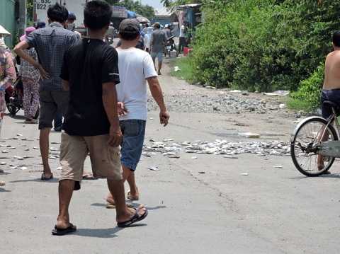 Sau khi cá bè bị chết hàng loạt, vì cho rằng, nguyên nhân cá chết là do các nhà máy, cơ sở chế biến hải sản ở xã Tân Hải, huyện Tân Thành xả nước thải ra sông nên các hộ dân có cá chết đã kéo nhau chở cá chết đổ trước cổng một số nhà máy chế biến hải sản.