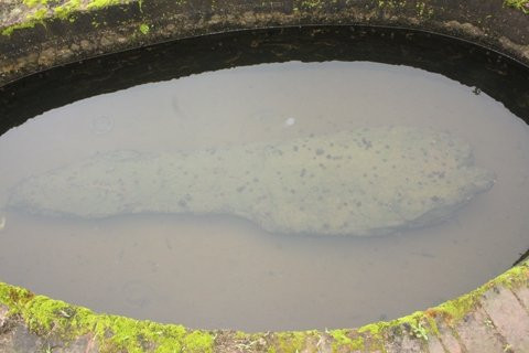 Theo quan sát của chúng tôi, một tảng đá xanh rêu phong nằm dưới đáy giếng. Tảng đá dài khoảng 1,5m, hình dáng như một con cá có kích cỡ lớn.