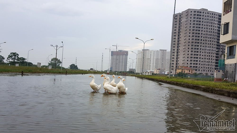 Trời không mưa nhưng các tuyến đường trong khu B và khu đất dịch vụ thuộc phường Yên Nghĩa (quận Hà Đông, Hà Nội) vẫn mênh mông nước, cả đàn vịt trắng bơi lội tung tăng.