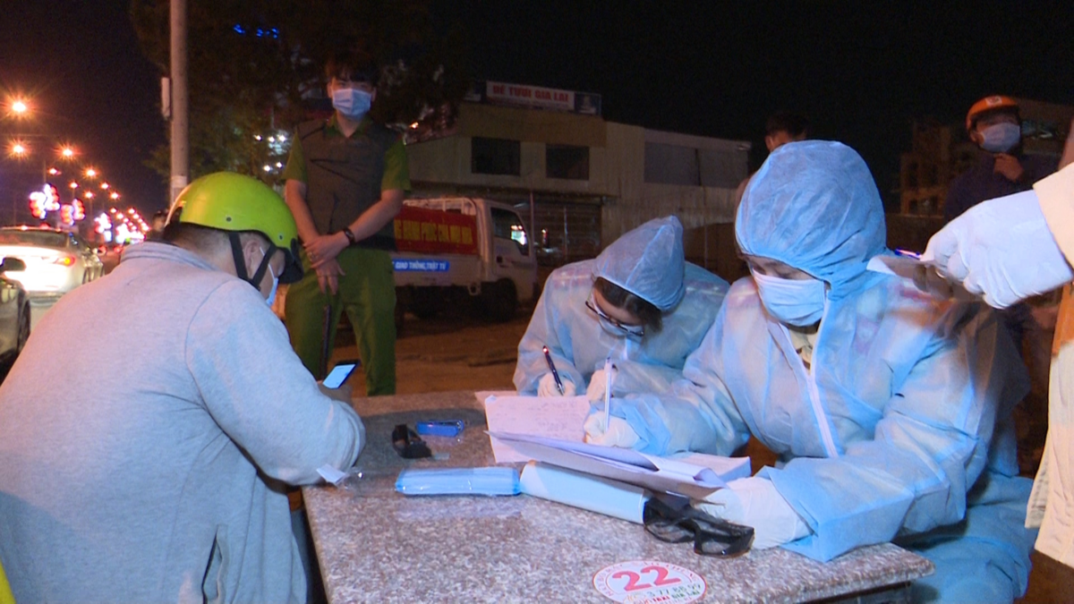 Lực lượng chức năng hướng dẫn người dân khai báo y tế. (Ảnh: Hiền Mai)