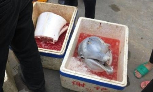 Theo các nhà động vật học, loài cá heo bị xẻ thịt ở trên có thể là một con cá heo trắng còn non thuộc giống cá heo lưng gù đang có nguy cơ tuyệt chủng ở Trung Quốc.