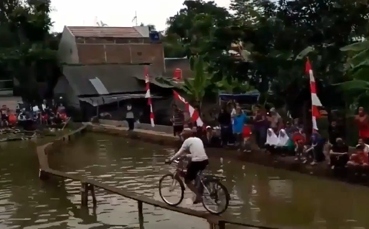 Những tay đua lần lượt thay nhau ngã xuống ao trong sự hò reo thích thú của đám đông xung quanh.