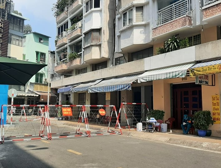 Phong tỏa Chung cư Sư Vạn Hạnh, Quận 5, TP.HCM nơi BN1451 sinh sống. (Ảnh: Mai Thúy)