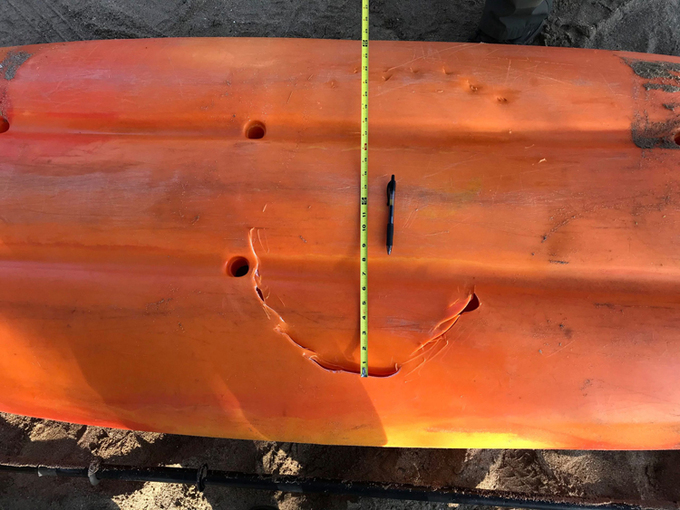 Vết cắn con cá mập để lại trên chiếc kayak. (Ảnh: Hawaii DLNR)