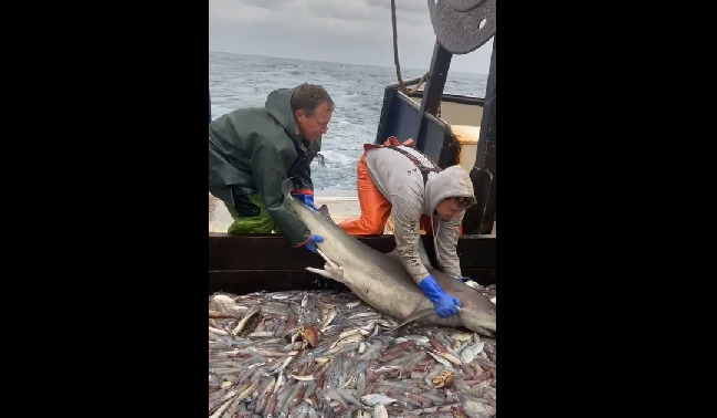 Trong đoạn video được chia sẻ chóng mặt trên Weibo, con cá mập non vô tình mắc vào mẻ lưới đầy tôm, cá, mực của các ngư dân ở New England, Mỹ.