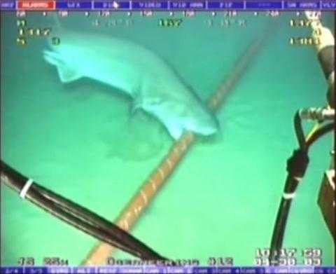 Một đoạn video được ghi lại bởi các thợ lặn chuyên nghiệp cho thấy con cá mập trắng dùng hàm răng sắc nhọn từ từ nhai đoạn dây cáp.