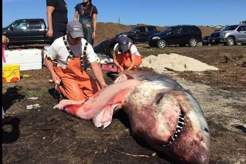 Con cá mập trắng dài gần 5m được tìm thấy bên bờ biển Massachusetts, Mỹ. Con vật này đã chết và các nhà khoa học vẫn đang đau đầu xác định xem nó đã chết vì mắc cạn hay bị đánh bắt trái phép.