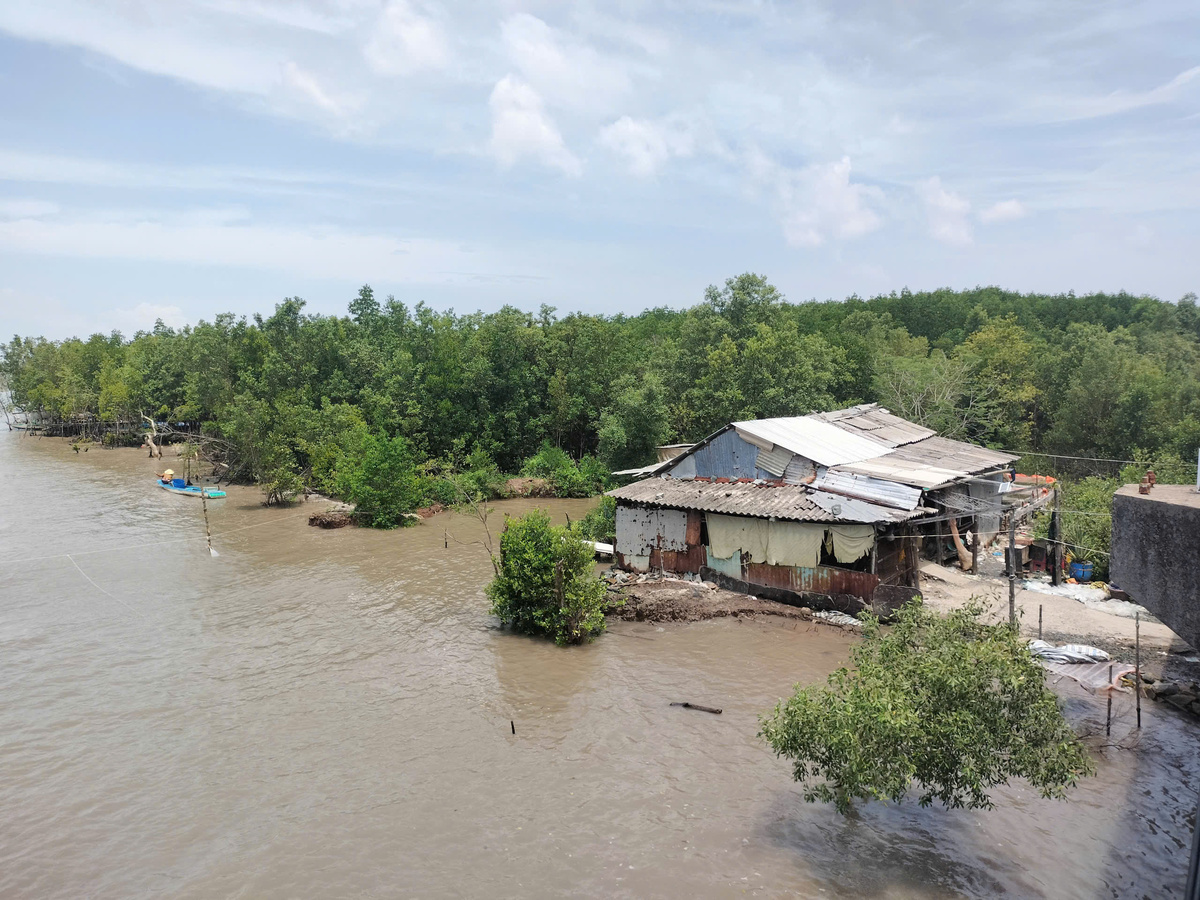 Nhà hộ dân ven biển ở xã Đất Mũi (tỉnh Cà Mau) luôn thấp thỏm trong tình trạng sạt lở.