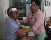 | Cụ Hùng nhập viện với nhát chém trên đầu cùng nhiều vết thương khác trên người. Ảnh: Diễm Hằng |