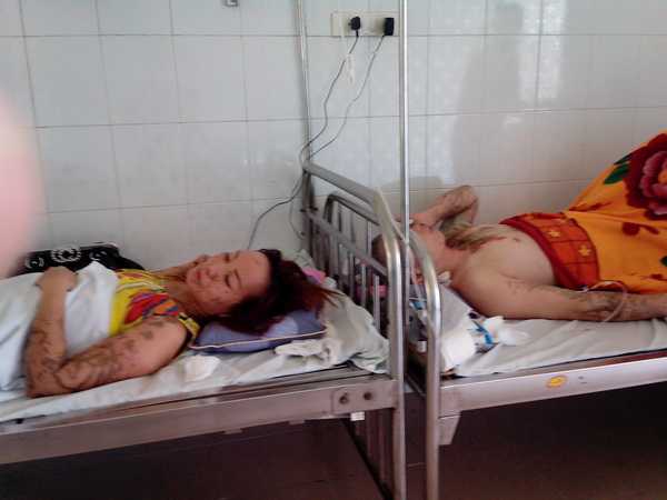 Chị Nguyễn Thị Thanh Hương - vợ anh Đại, 35 tuổi, nằm cạnh giường chồng - đỡ hơn một chút, là người tỉnh táo hơn cả. Tuy nhiên, những vệt axít còn bám trên da vẫn đang bỏng rộp.