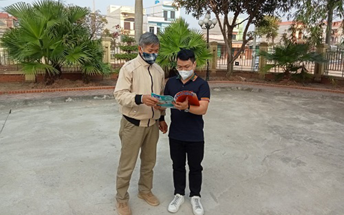 Viên chức BHXH huyện Tiền Hải tuyên truyền cho người dân xã Nam Hải về mức giảm trừ khi tham gia BHYT hộ gia đình.
