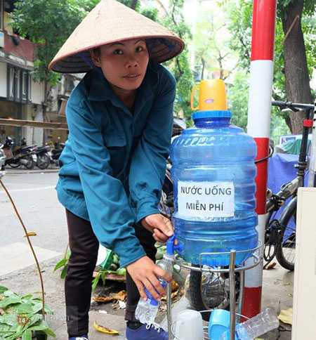 Vào những ngày nắng nóng đỉnh điểm vừa qua, ở Hà Nội cũng xuất hiện những bình nước trà đá, bình nước lọc miễn phí ở một vài con phố khiến không ít người cảm thấy mát lòng. - (phản ánh trên Trí thức trẻ).