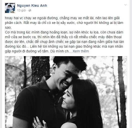 Trên trang cá nhân, Kiều Anh chia sẻ: "Hôm nay (13/3) hai vợ chồng chạy xe ngoài đường chẳng may xe mất lái lao lên giải phân cách. Rất may là chỉ có xe bị xây xước, người không bị làm sao".