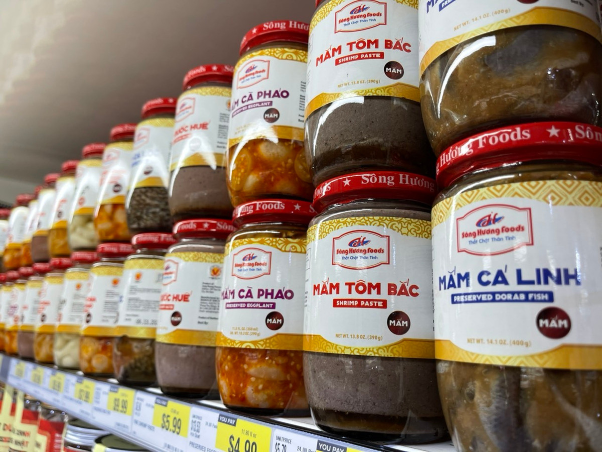 Các sản phẩm của Sông Hương Foods lên kệ trong siêu thị tại Mỹ. (Ảnh: DNCC)