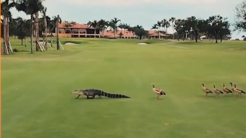 Cá sấu bị bầy vịt đuổi ra khỏi sân golf