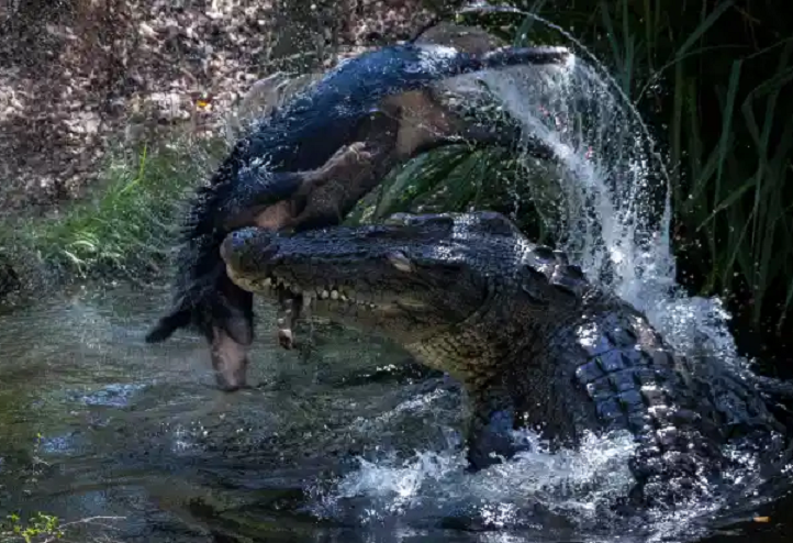 Trong bức ảnh, con cá sấu khổng lồ quăng con lợn rừng nhỏ con lên không trung, trước khi xé nhỏ con mồi một cách tàn nhẫn rồi ăn nó.