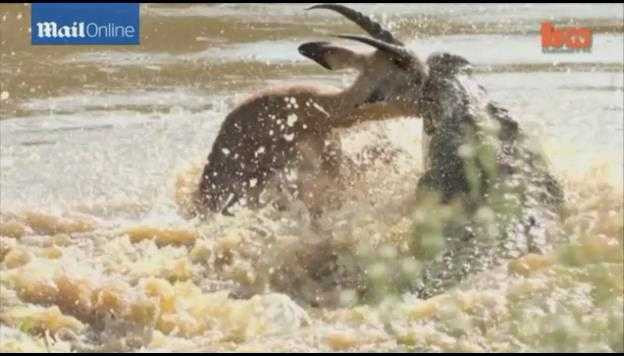 Con cá sấu há miệng giữa sông, chỉ chờ con linh dương nhảy qua là nó đớp gọn con mồi.